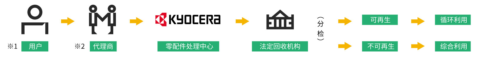 通过本京瓷回收体系,进一步推进了对资源节约、环保的考虑。可再利用的废弃物回收后,交予法定废弃物处理机构进行再利用;对不可再生的废弃物交予法定废弃物处理场,根据国家法规进行统一处理,以解决用户对废弃产品污染环境的担忧。